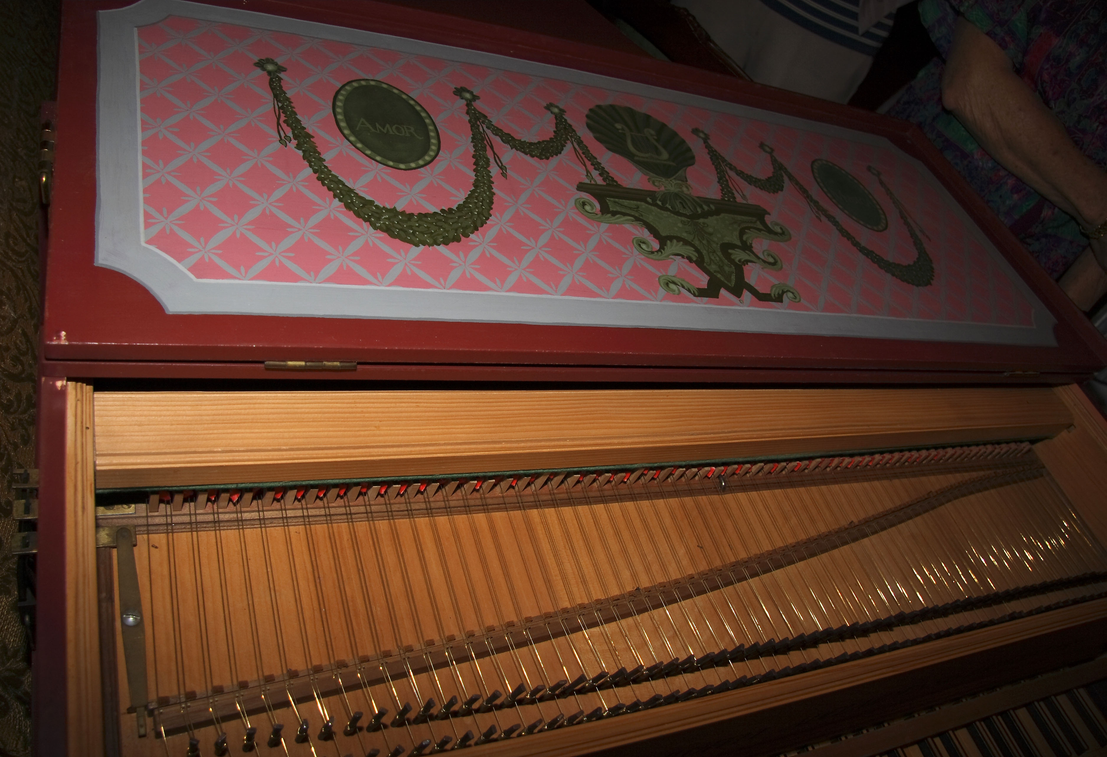 interior, rustic landscape with cottage, painted formal composition and ‘Amor Musica’ with swags over keyboard flap